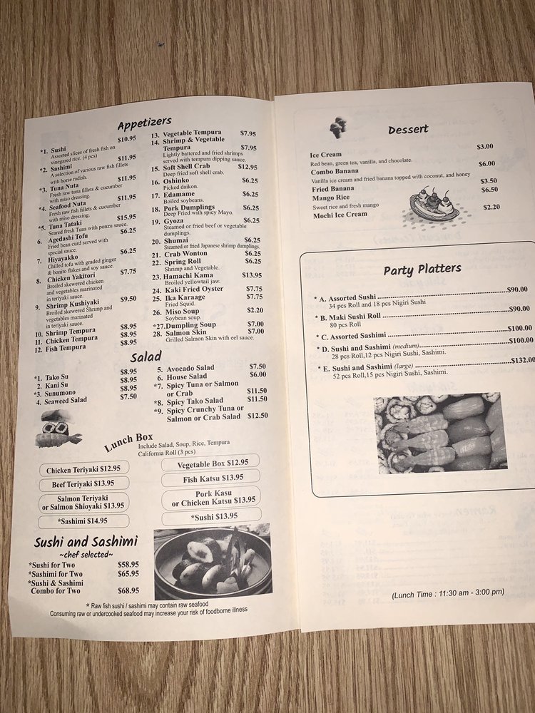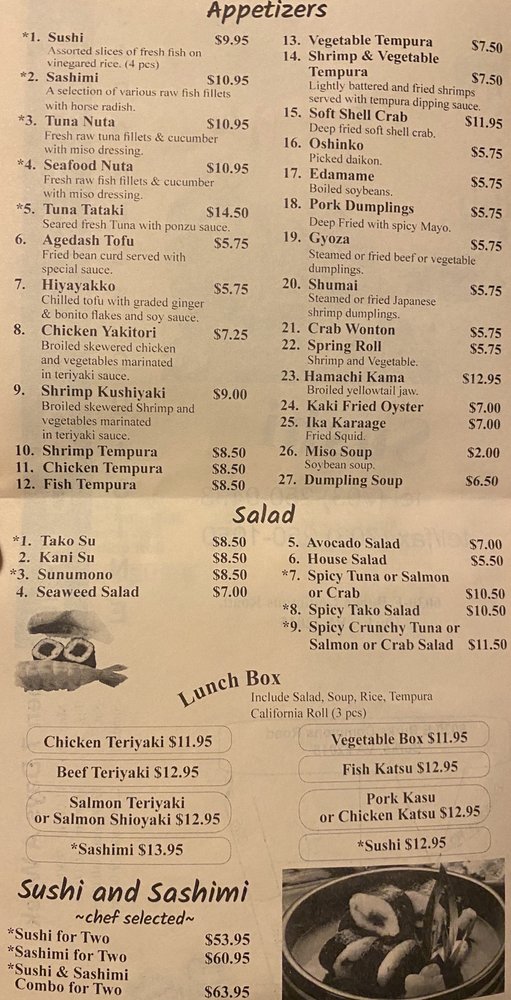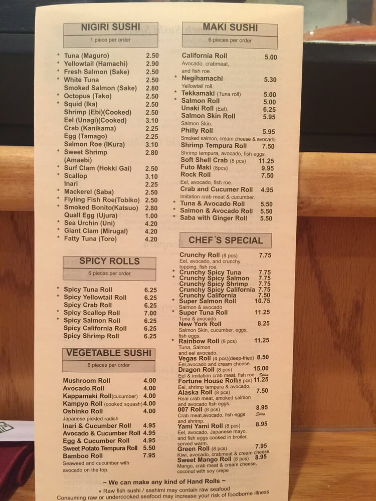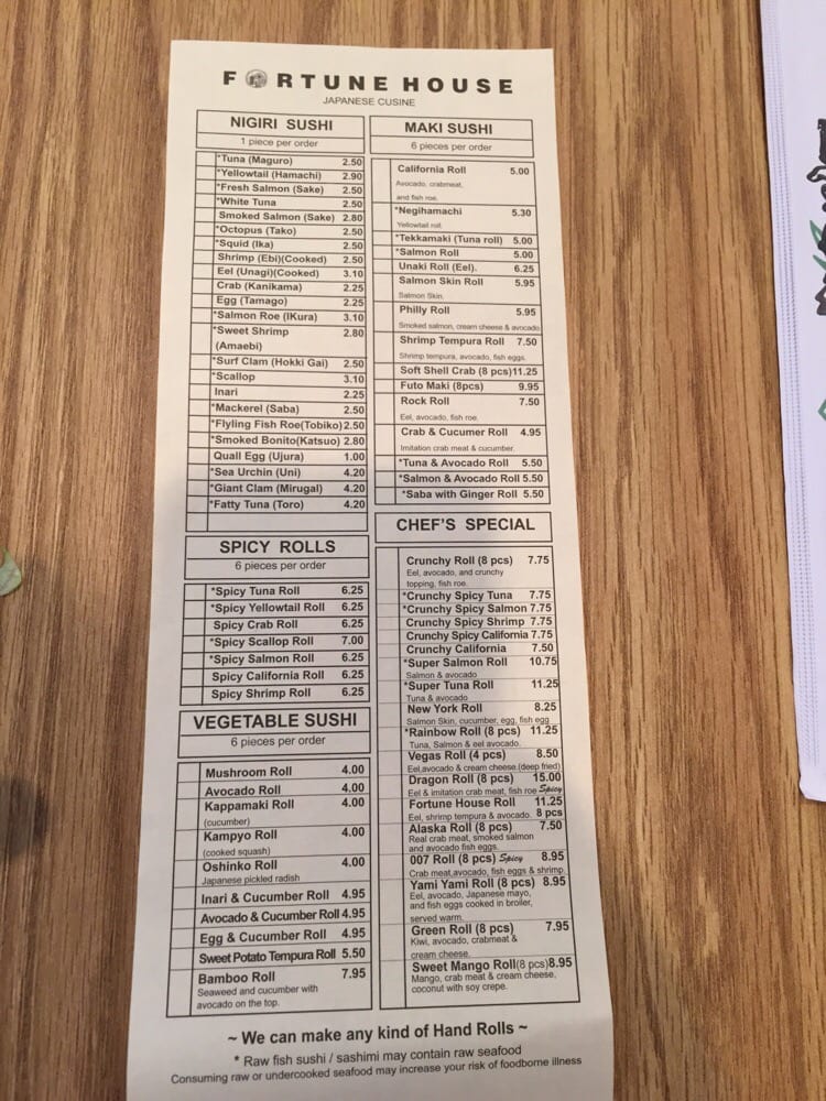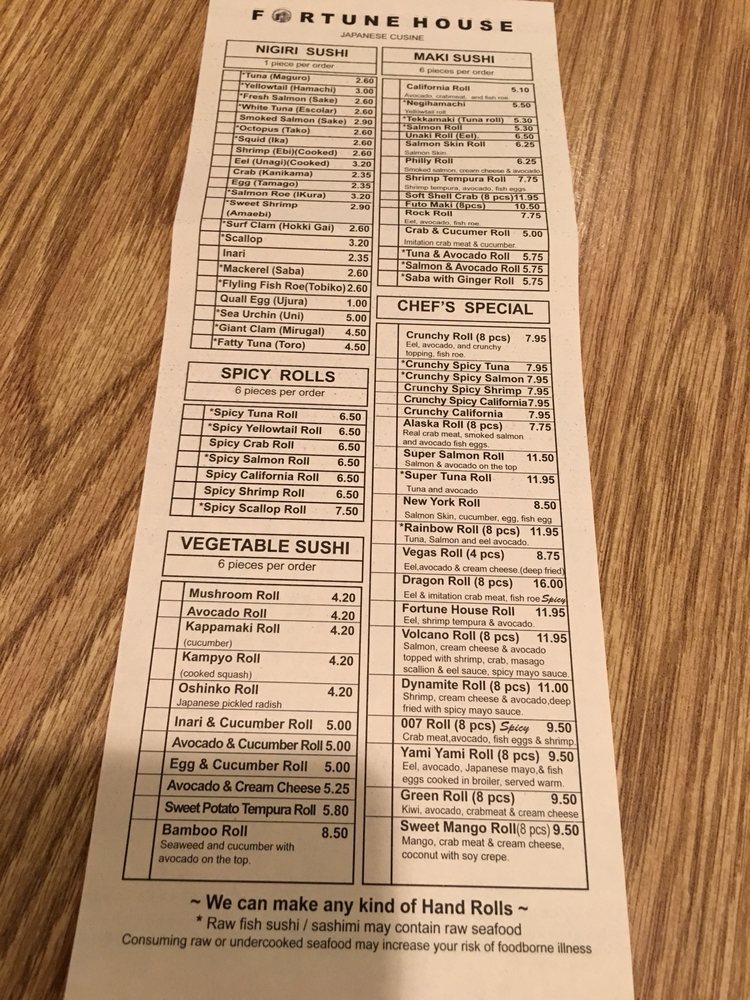 Introducing the menu at Fortune House, a hidden gem in Burke, VA known for its fresh and flavorful sushi dishes. The appetizers, such as the Sushi Raw and Tuna Tataki, showcase a variety of raw fish with unique flavors. For salads, the Tako Su Salad and Spicy Tuna Salad offer a refreshing and spicy twist. The Sushi and Sashimi options for 2 are perfect for sharing and indulging in a wide selection of premium seafood. Customers rave about the quick service, fresh ingredients, and welcoming atmosphere. The sushi platter and lunch specials are highly recommended, making Fortune House a must-try destination for sushi lovers in the area. Experience quality over quantity with each bite at this casual yet exceptional Japanese restaurant.