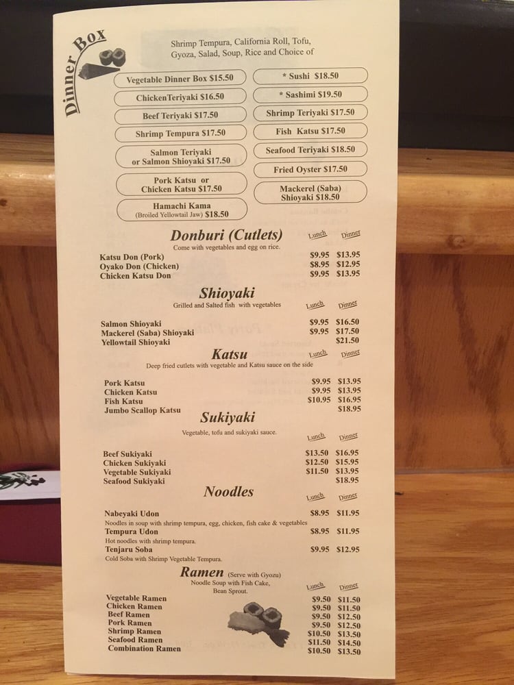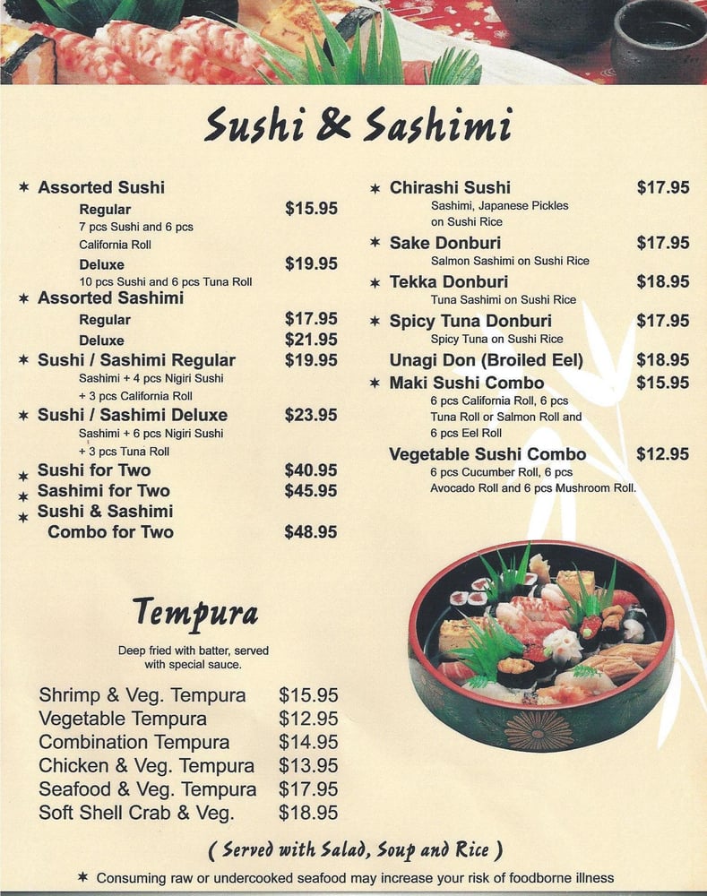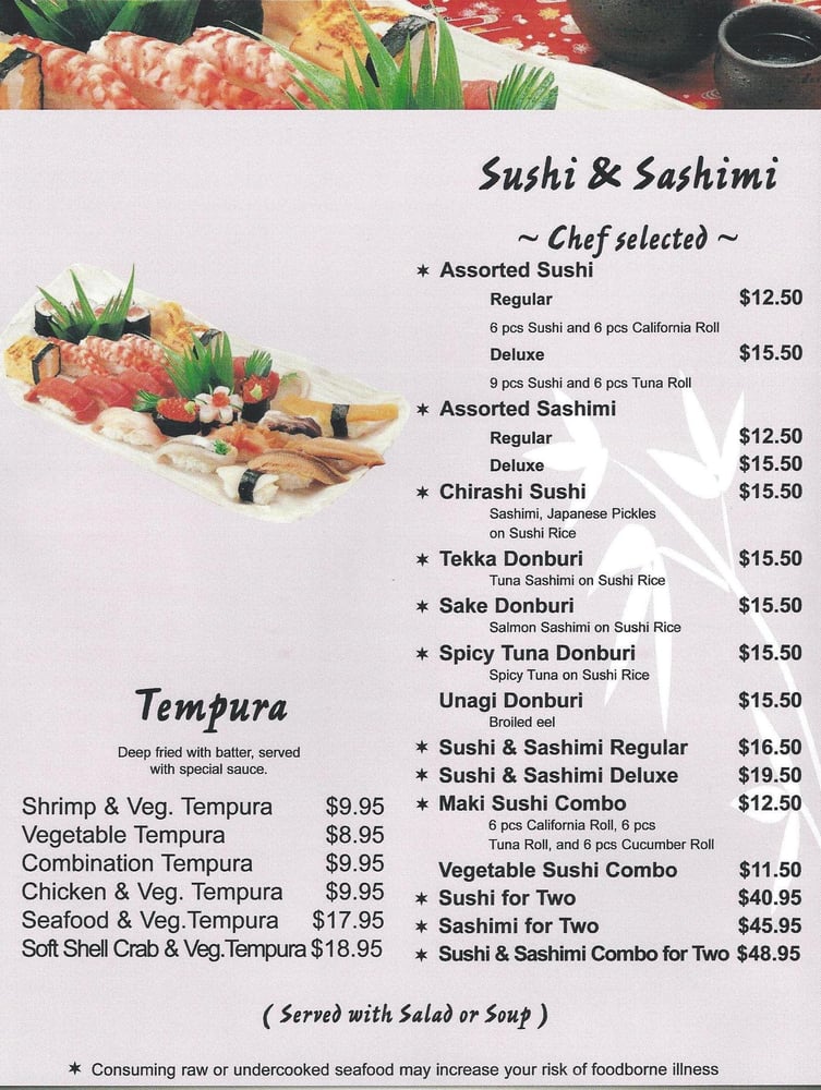 With plum sauceServed with shrimp and vegetable tempura, California roll, tofu, gyoza, salad, soup and rice.